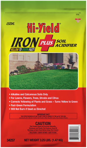 Hi-Yield® Iron Plus Soil Acidifier contains a pelletized material that will turn yellow plants and grasses green fast. Apply to Lawns, Trees/Shrubs, Garden/Plants.